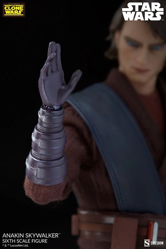 The Anakin Skywalker Sixth Scale Figure includes a number of stylized hands and swap-out accessories to give collectors a wide range of display options for the Jedi general. Anakin Skywalker comes with four pairs of stylized hands including a pair of grip hands, a pair of neutral hands, a pair of force hands, and a pair of fists for a wide variety of gestures and pose combinations. In addition, he comes with both a lightsaber hilt and lightsaber with its blue tapered blade unleashed for battle action. Finally, Anakin includes a holoprojector accessory with a sculpted Ahsoka Tano™ hologram for communicating with his Padawan.