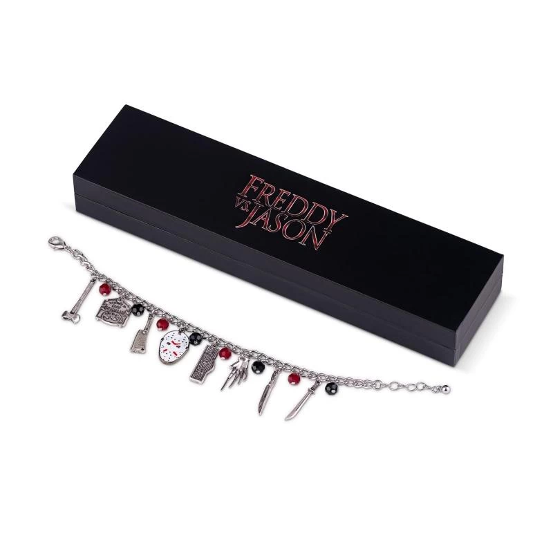 Sturdy silver metal alloy chain bracelet features red and black beads and multiple enamel charms depicting various Freddy vs. Jason icons, including Jason’s hockey mask and Freddy’s razor glove. Bracelet comes in a handsome Freddy vs. Jason-branded clamshell box, perfect for gift giving.