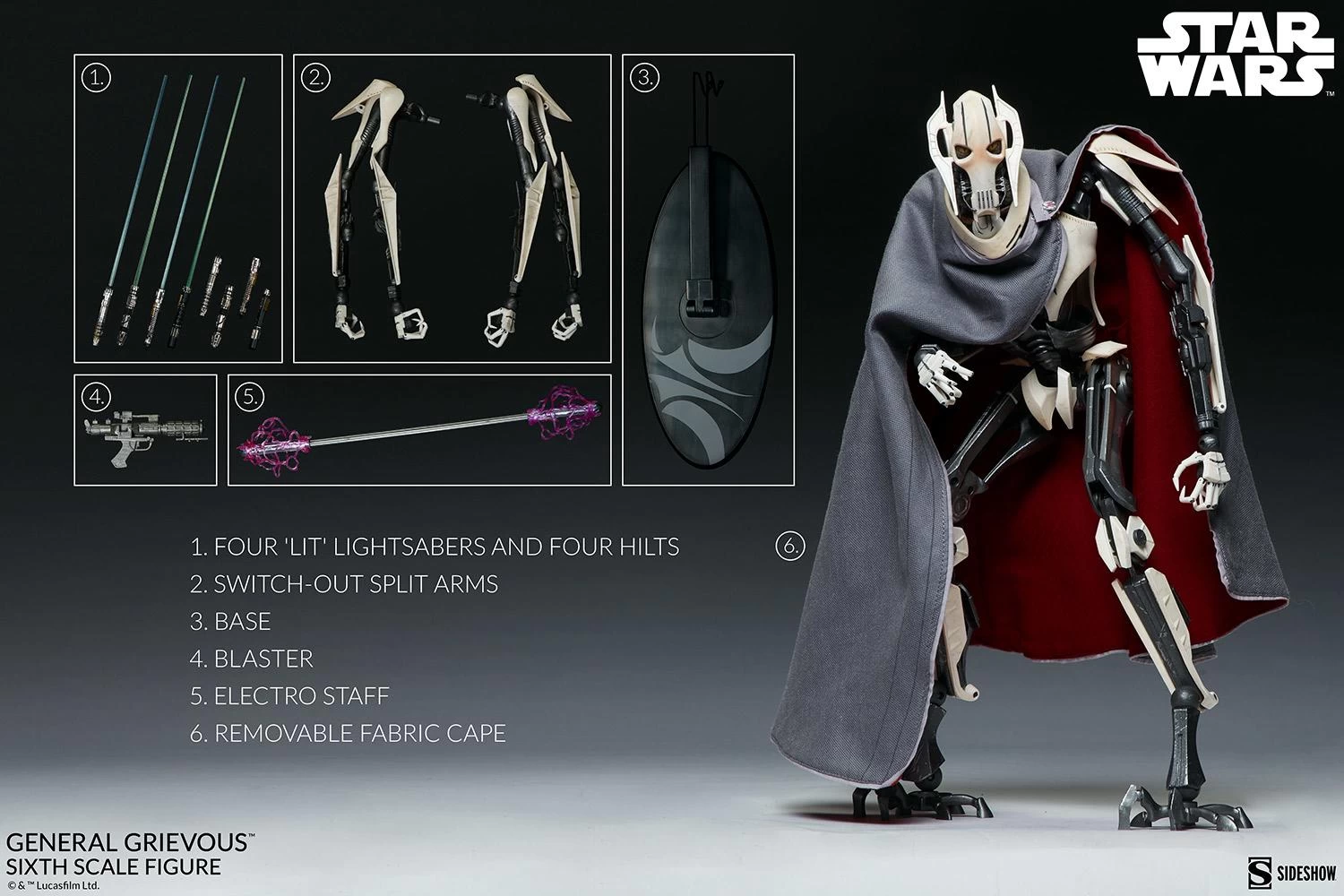 The General Grievous Sixth Scale Figure includes a pair of fused arms and a pair of switch-out split arms for recreating his infamous battle stance. His articulated fingers allow for easy posing alongside the array of accessories in his armory, including a blaster, an electro staff, and his four lightsabers with removable hilts. The figure comes with a black stand base to help balance and support any number of action-packed poses you can devise for this celebrated Star Wars villain.