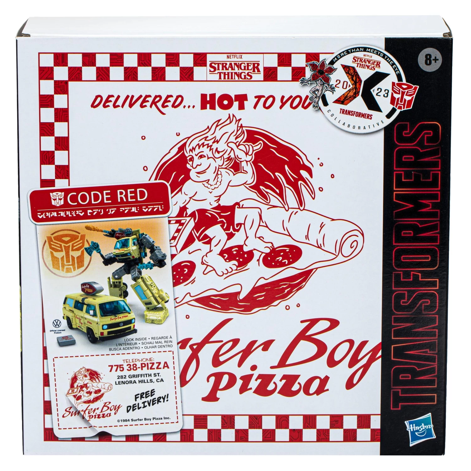 The worlds of Transformers robots and Stranger Things collide with the Stranger Things x Transformers Code Red mash-up pack! The iconic Surfer Boy pizza van from Stranger Things is now a Transformers robot! This figure converts from robot mode to show-inspired licensed Volkswagen Vanagon alt mode and features screen-accurate deco and details. This pack comes with show-inspired accessories including a bat, axe, Surfer Boy pizza blaster, and pizza box accessories, plus a blast effect. Transformers robots have always been — More Than Meets the Eye — but now, through the Transformers Collaborative, fans can experience these larger-than-life characters as they team-up, mash-up, and meet up with other characters, teams, and people who share this same special quality.