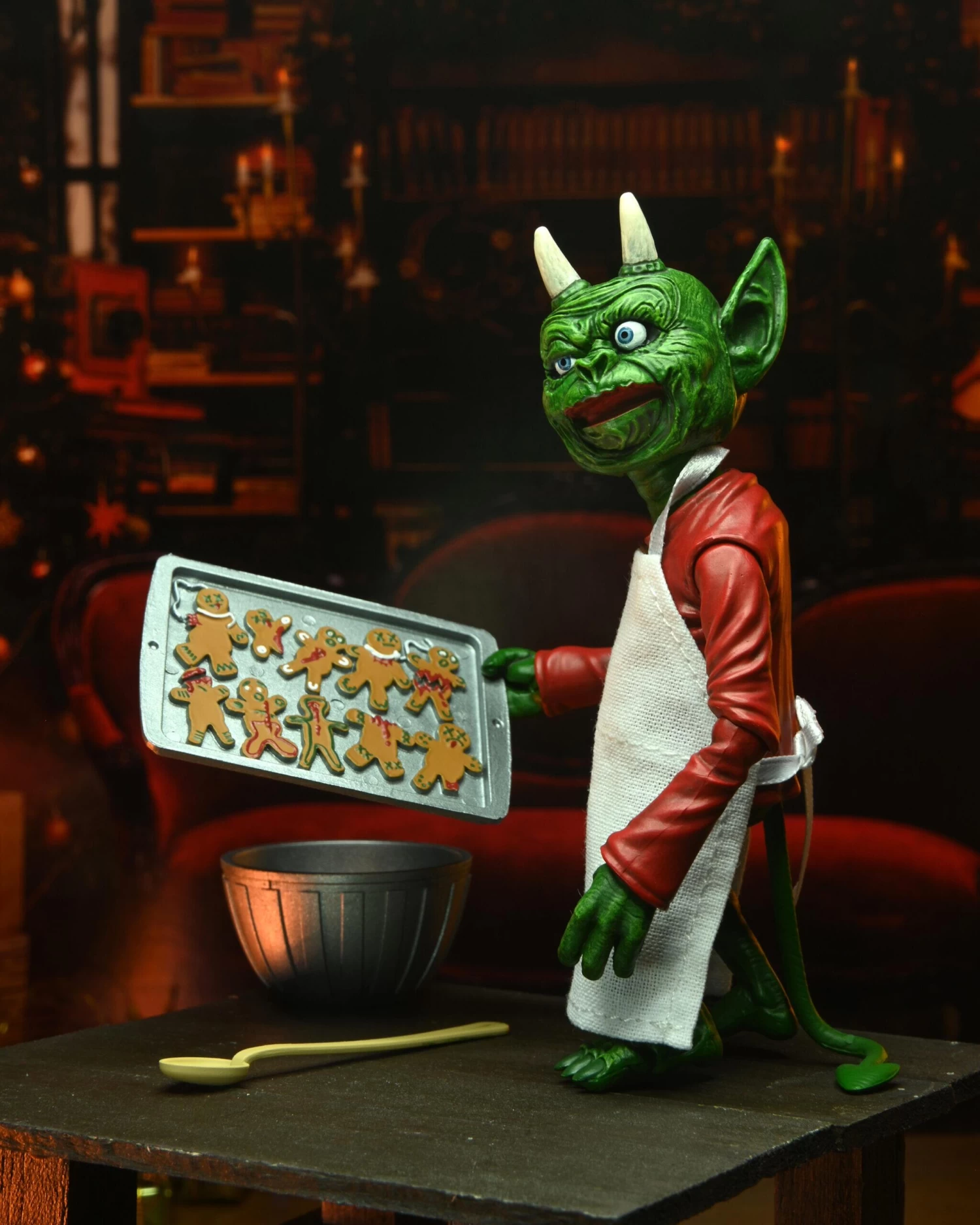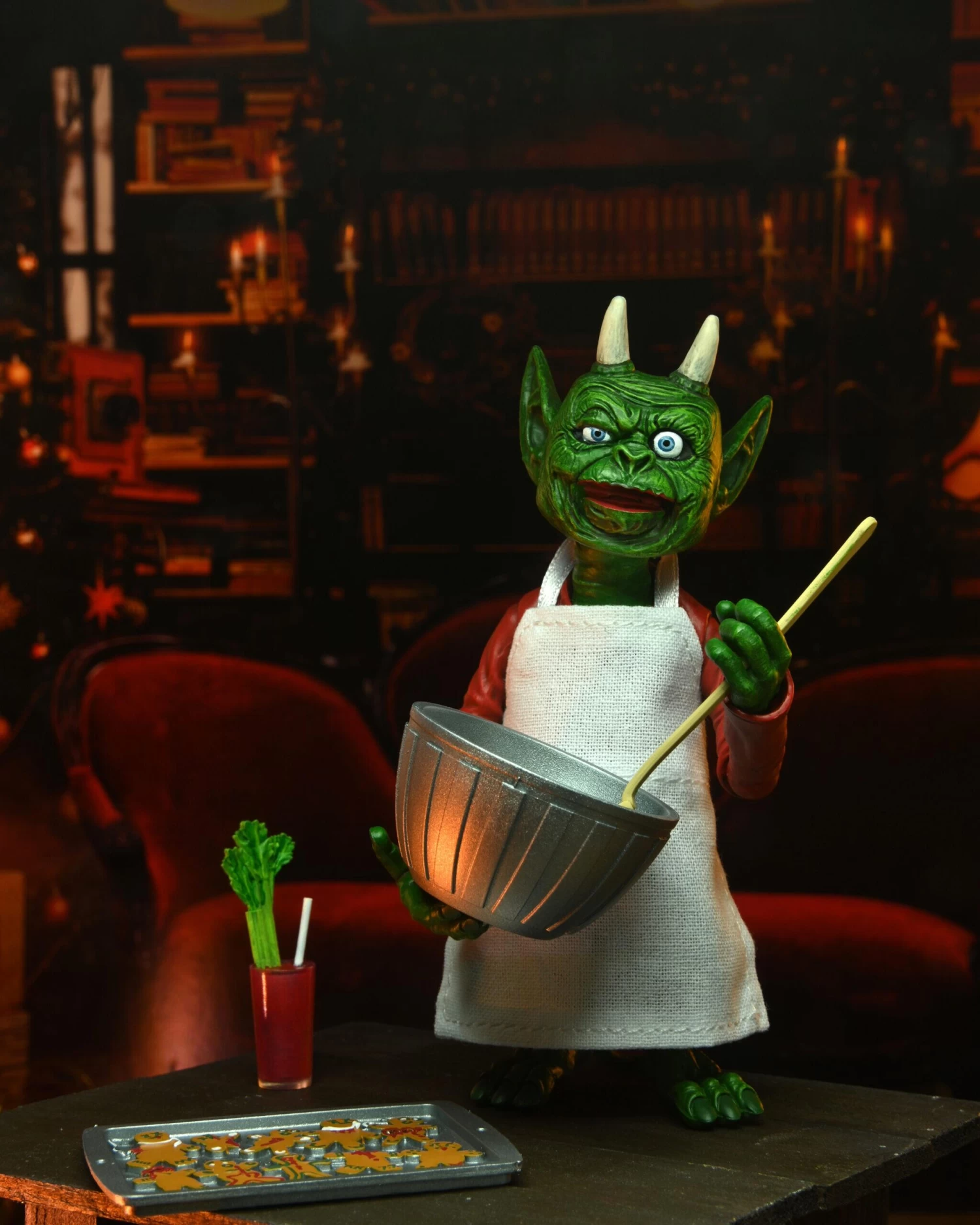 The devilishly delightful Cassandra Peterson has played the part of Elvira for more than 40 years with grace, humor and more than a little camp. NECA is proud to present this hauntingly holiday themed figure for your horror collection. This Deluxe Scary Xmas Elvira 8” action figure is fully articulated and features tailored fabric clothing, two interchangeable expressions, Bloody Mary, naughty list with quill, tray of gingerdead men cookies, and an articulated ‘Creature Who Was Stirring’ figure with tailored fabric apron, bowl, and spoon. Comes in window box packaging with slipcover.