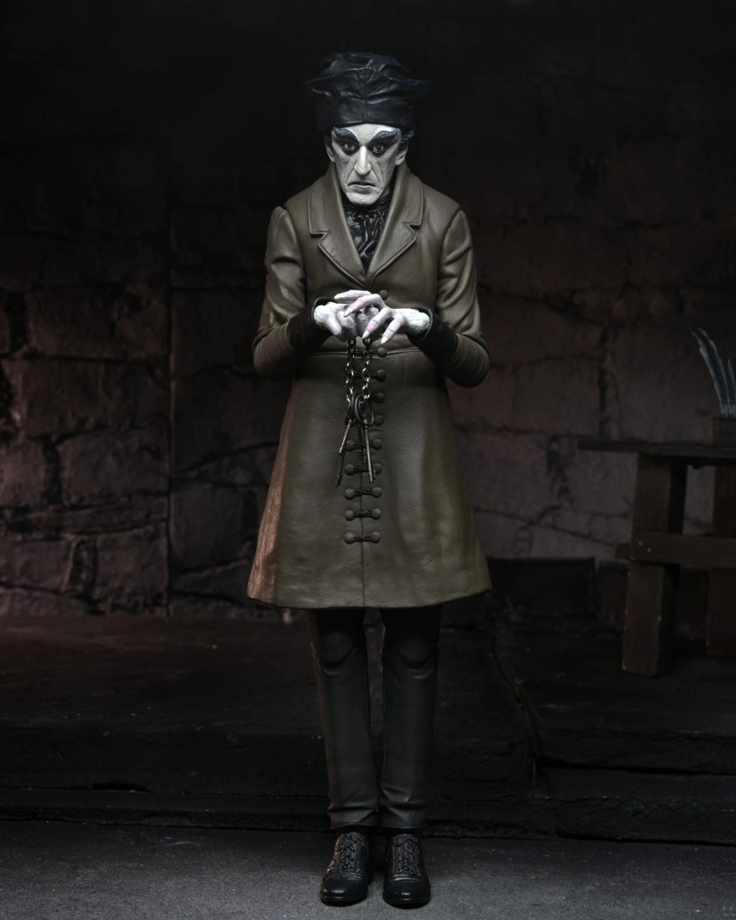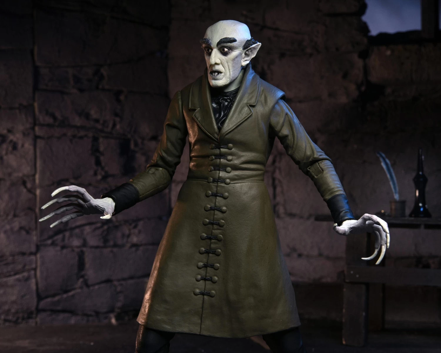 The 1922 vampire film Nosferatu is considered an influential masterpiece of the silent era, and over 100 years later it still holds a place in the imaginations of horror fans everywhere. NECA’s Ultimate Count Orlok action figure presents the eerie count in sensational style, with details and accessories carefully sourced from the film. This gothic figure is fully articulated and includes 3 interchangeable heads and a variety of different hands for endless poses. Accessories include hat, five keys on a chain, quill pen, ink pot, replica letter, and bottle. Comes in display-friendly window box packaging with opening front flap.