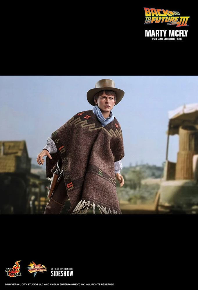 The stunningly detailed collectible figure is specially crafted based on the appearance of Michael J. Fox as Marty McFly in Back to the Future III, featuring a newly developed head sculpt and a cowboy hat with amazing likeness, screen accurate costume, a brown patterned poncho, cowboy scarf, an array of weapon and accessories including a pistol, bulletproof stove plate, pie dish, framed photo from Doc Brown, photo of Doc’s tomb, communicator with battery, hoverboard, and a figure stand!