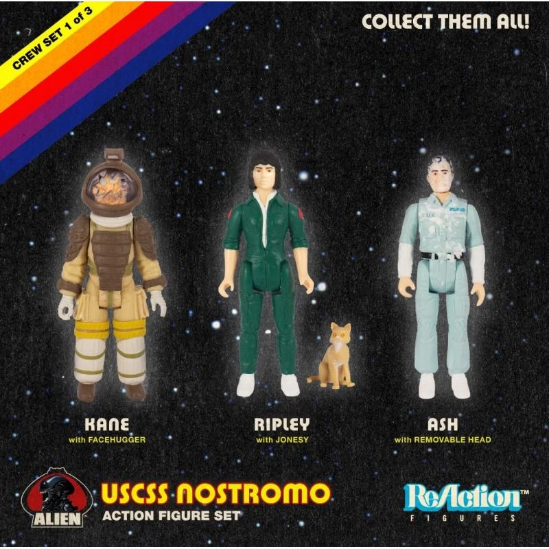 “In space no one can hear your scream…” Alien returns with Wave 3 of the 3.75″ ReAction Figure series! Crew Set 1 of 3 includes Ash with removable head, Ripley with Jonesy the Cat, and Kane Spacesuit with Facehugger and cracked helmet.